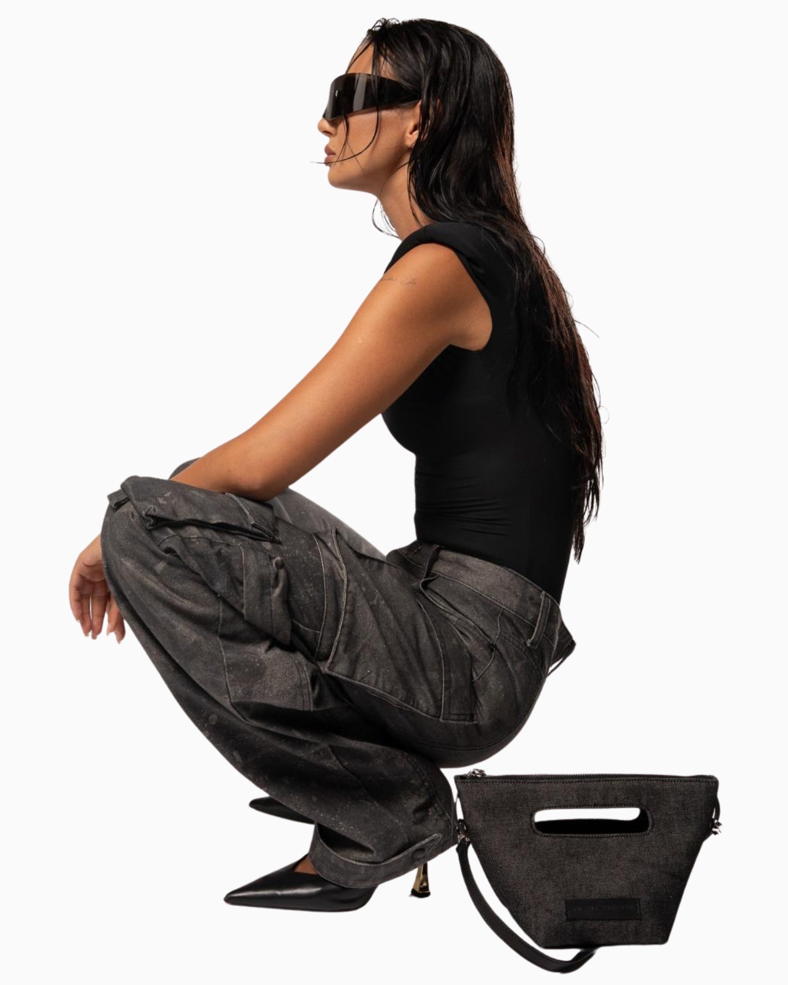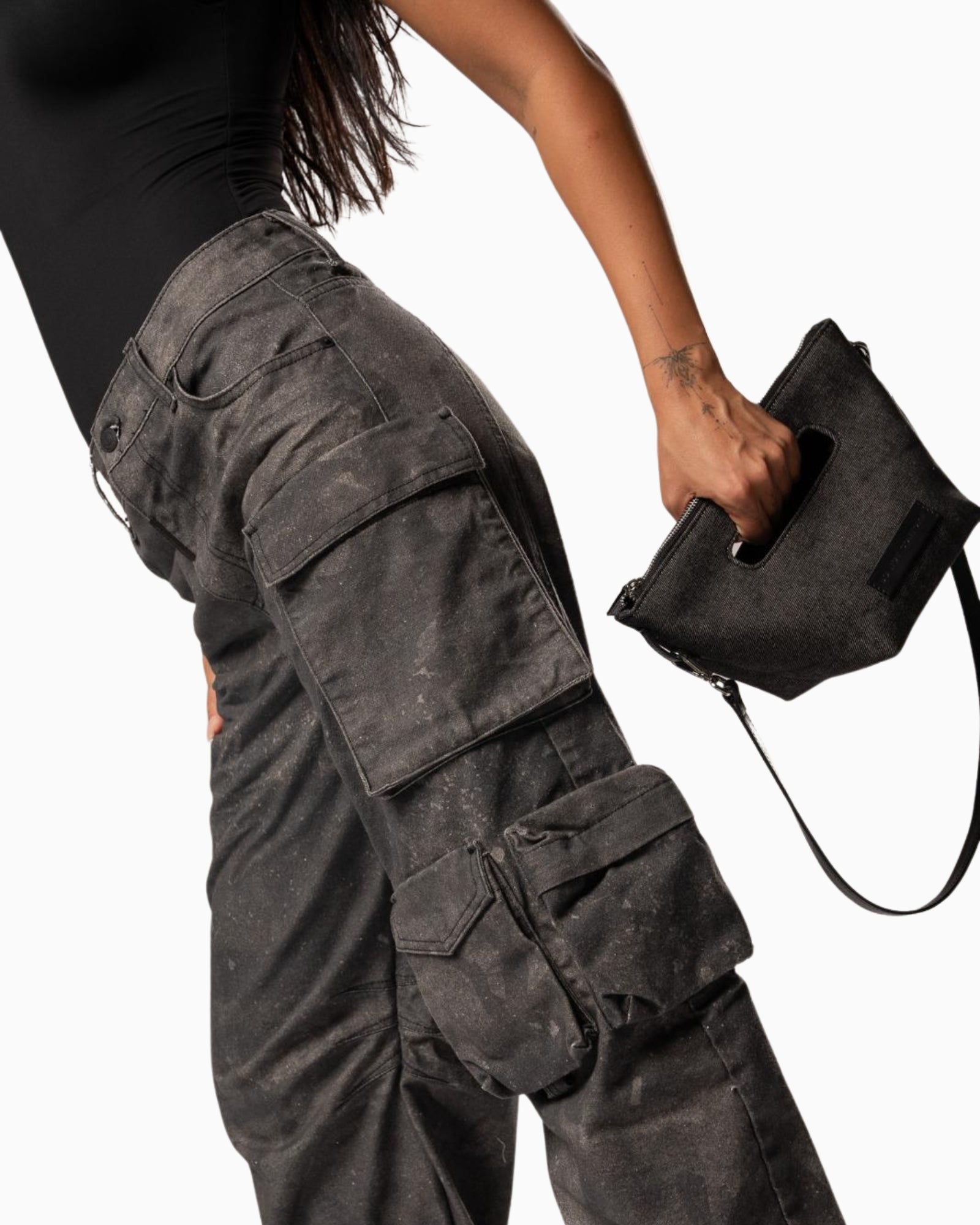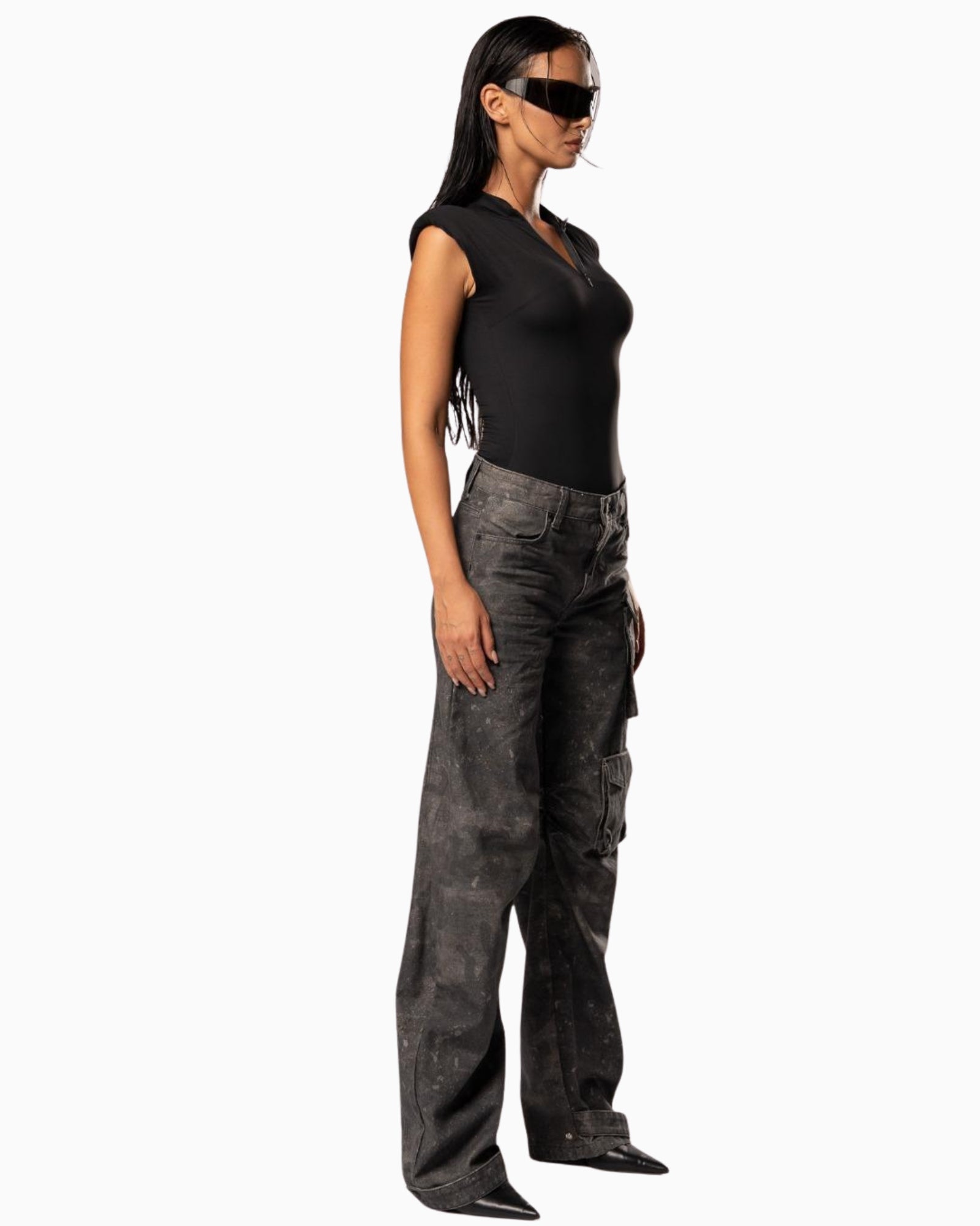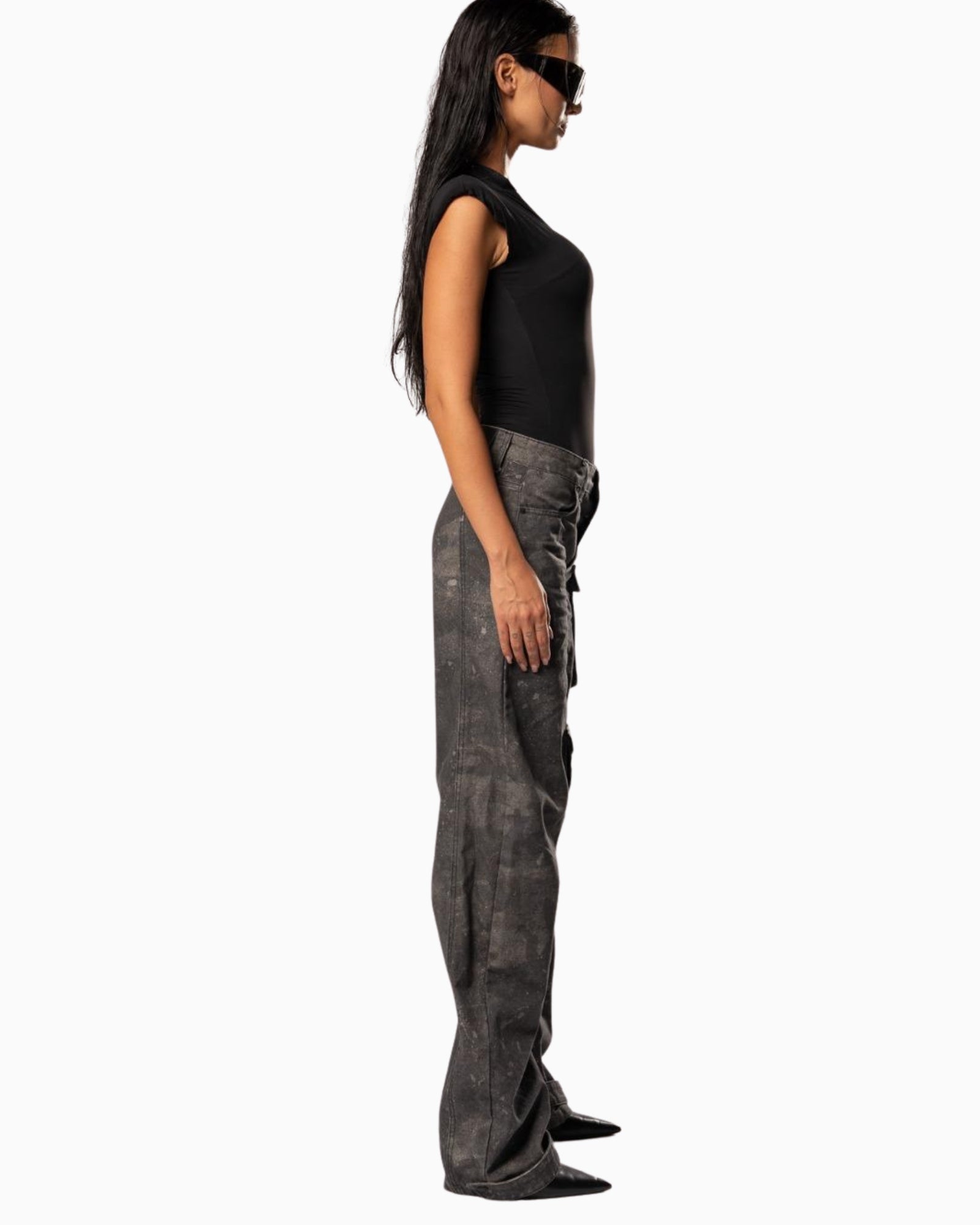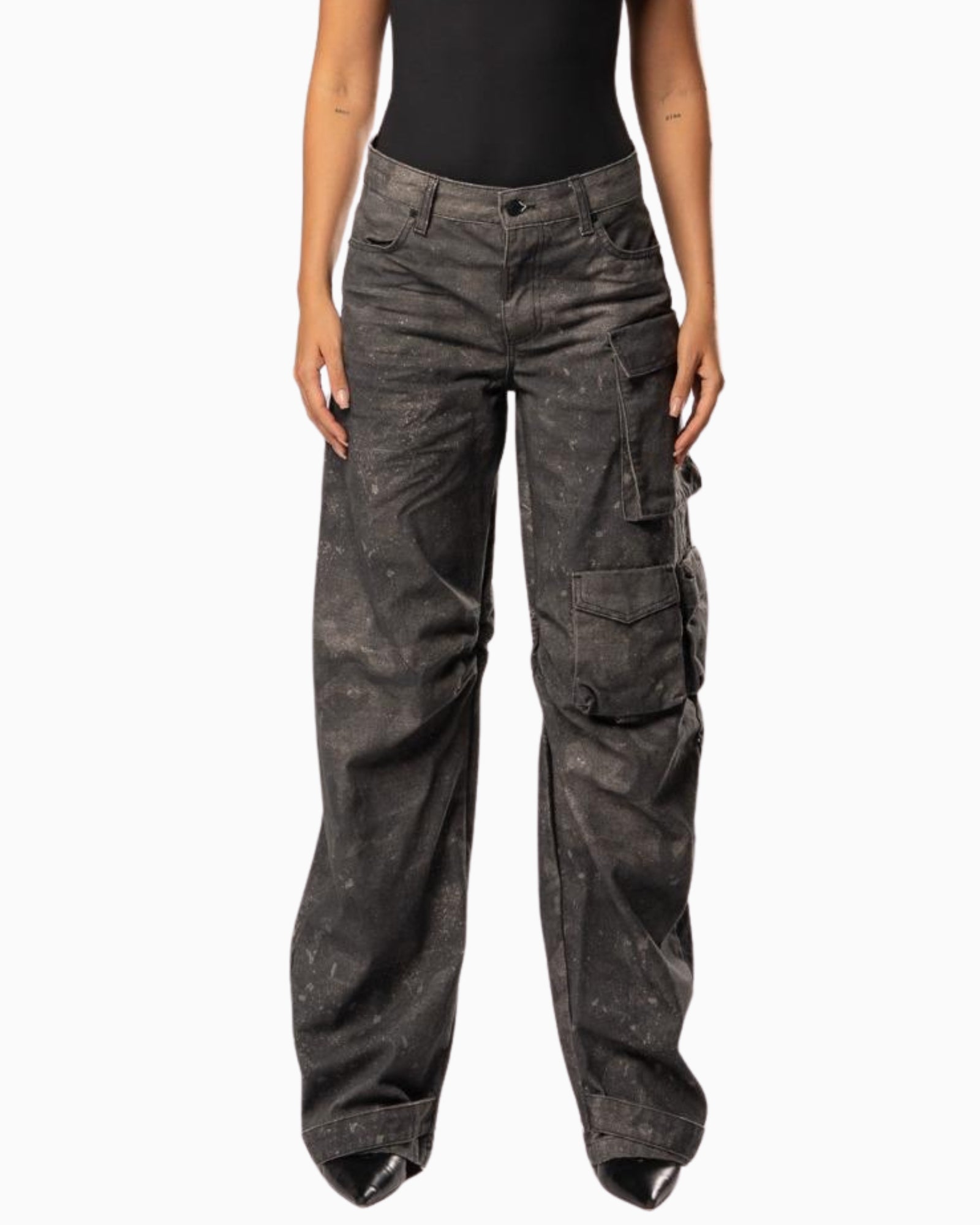 Jeans baggy da donna realizzati in Italia, caratterizzati da una linea ampia e strutturata che offre massimo comfort e un’estetica streetwear contemporanea. Il modello presenta tasche cargo applicate, vita regolare e gamba larga con caduta morbida, ideali per creare look moderni e di forte personalità.
