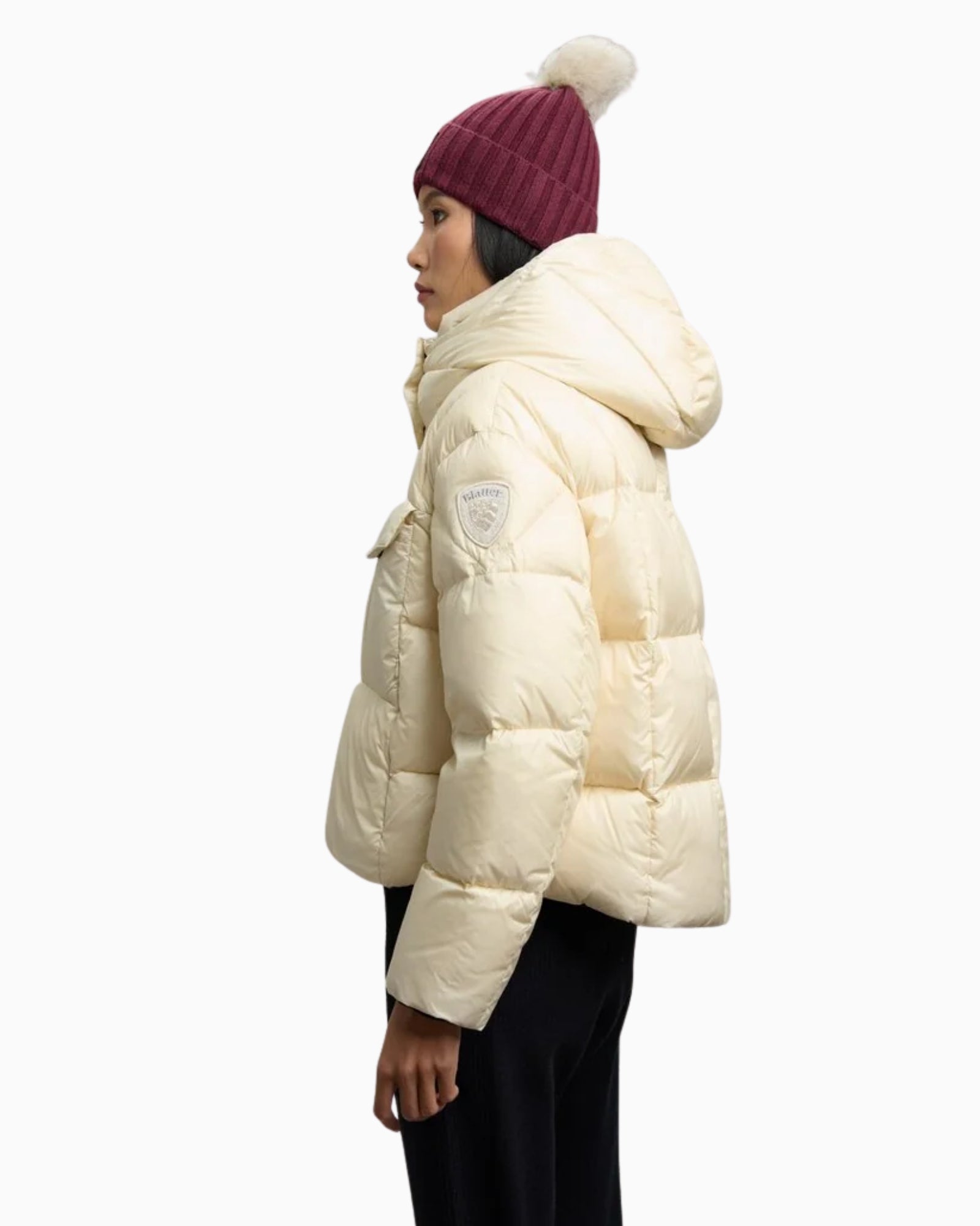 Piumino trapuntato a linee orizzontali con imbottitura calda e non ingombrante.