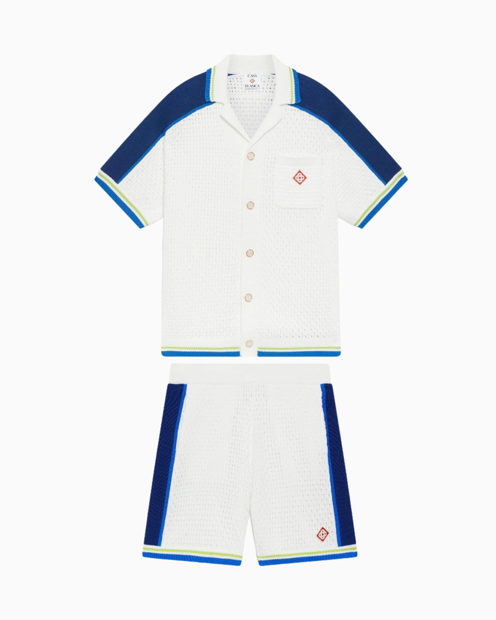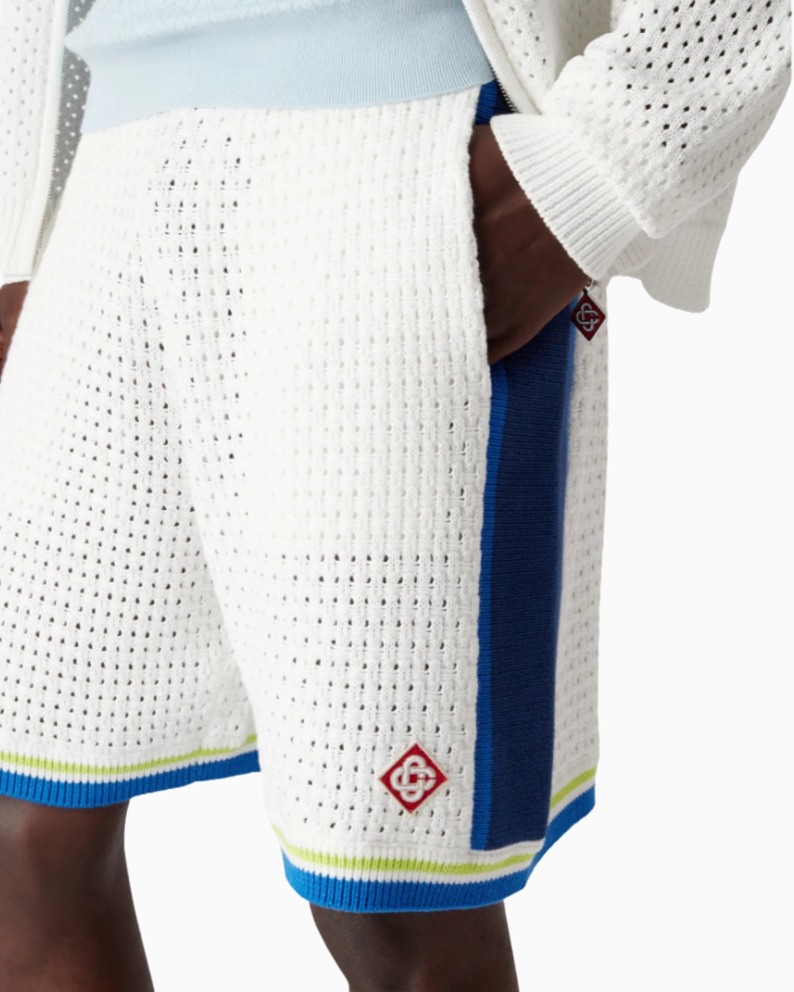 Gli shorts all'uncinetto bianchi e blu sono un modello raffinato,