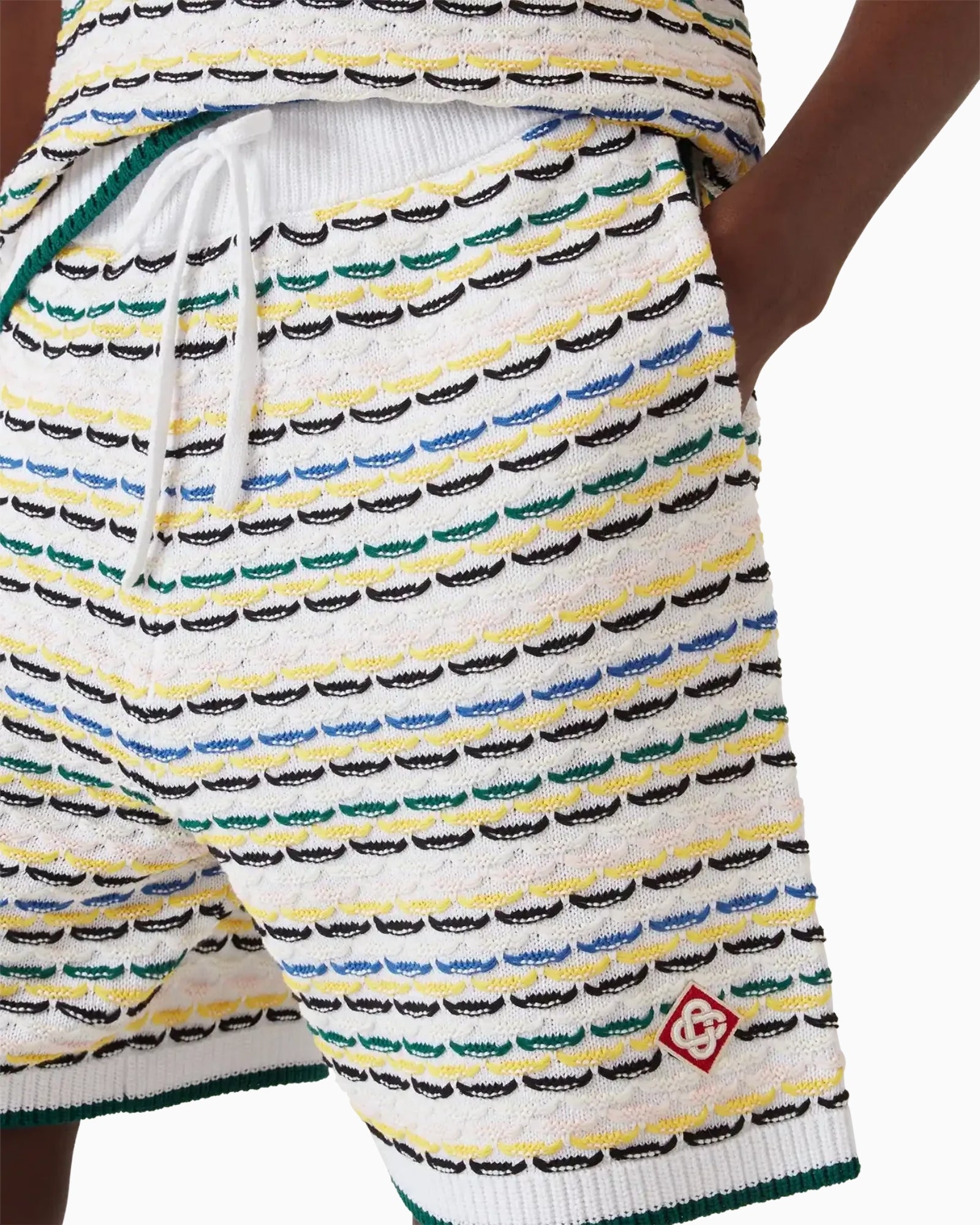 Gli shorts con cuciture a punto ritroso sono un modello lavorato a maglia con il logo a forma di diamante, simbolo della casa.