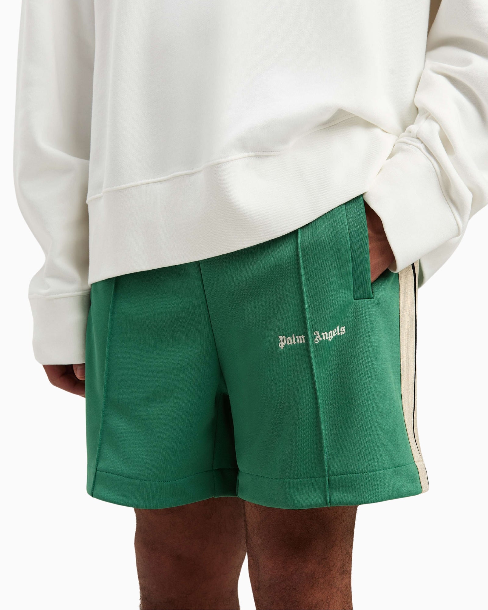 Pantaloncini sportivi da uomo color verde bosco con triplo elastico in vita, iconico nastro sui lati e logo Palm Angels ricamato in bianco sul davanti.