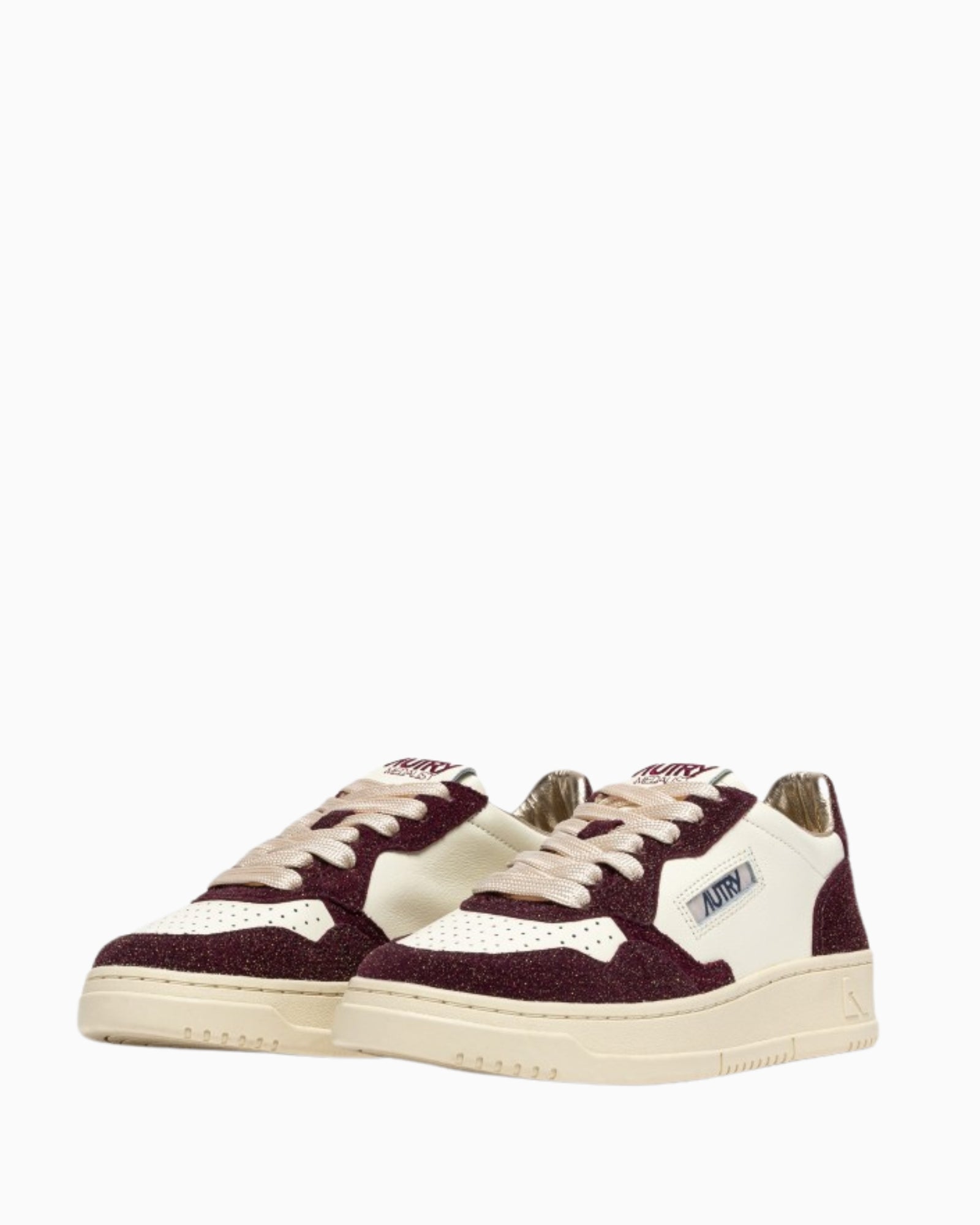 - tomaia in pelle avorio e suede in bordeaux glitterato