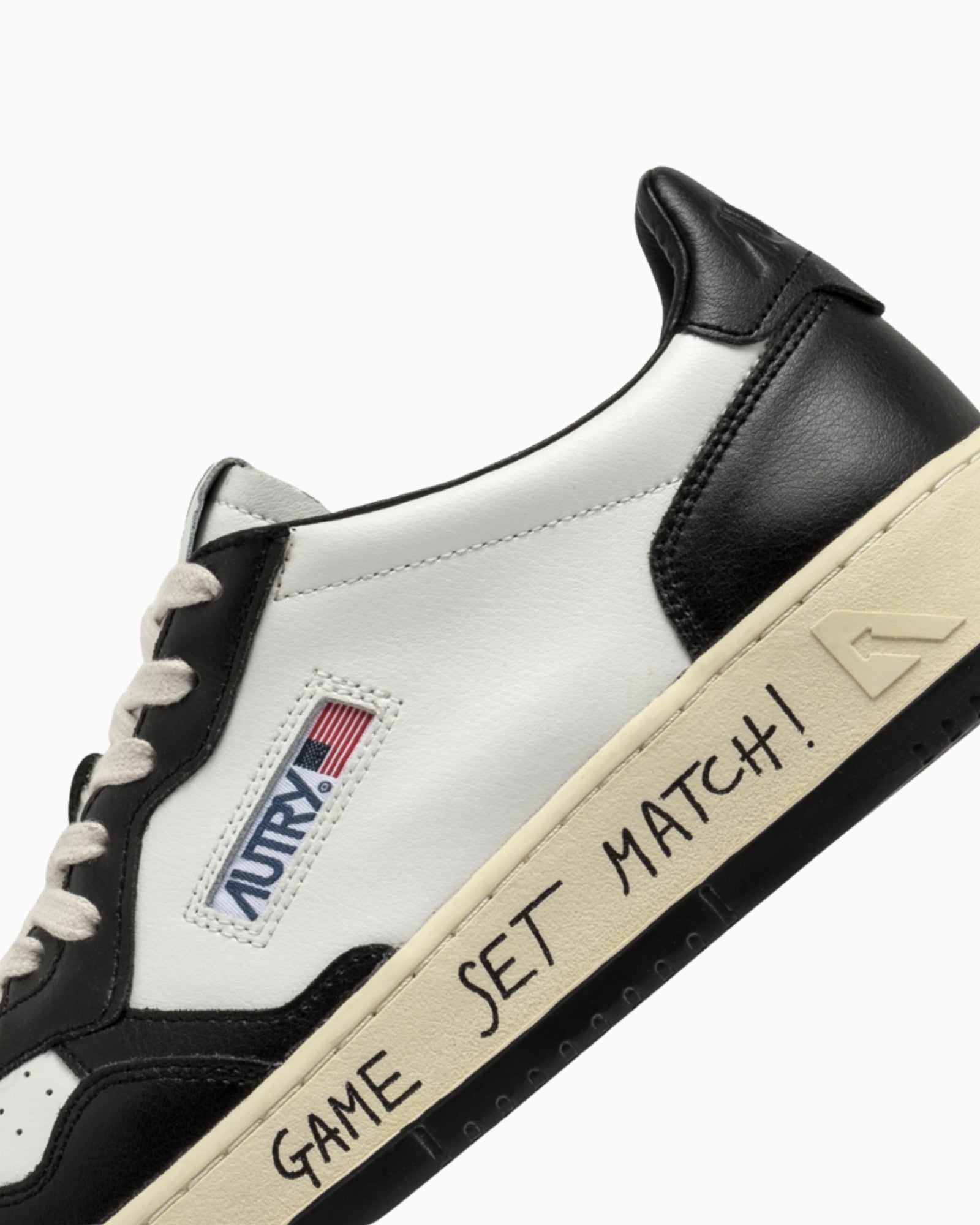 La suola in gomma riporta immediatamente alle atmosfere del tennis con il lettering personalizzato "Game Set Match!" in stile graffiti.