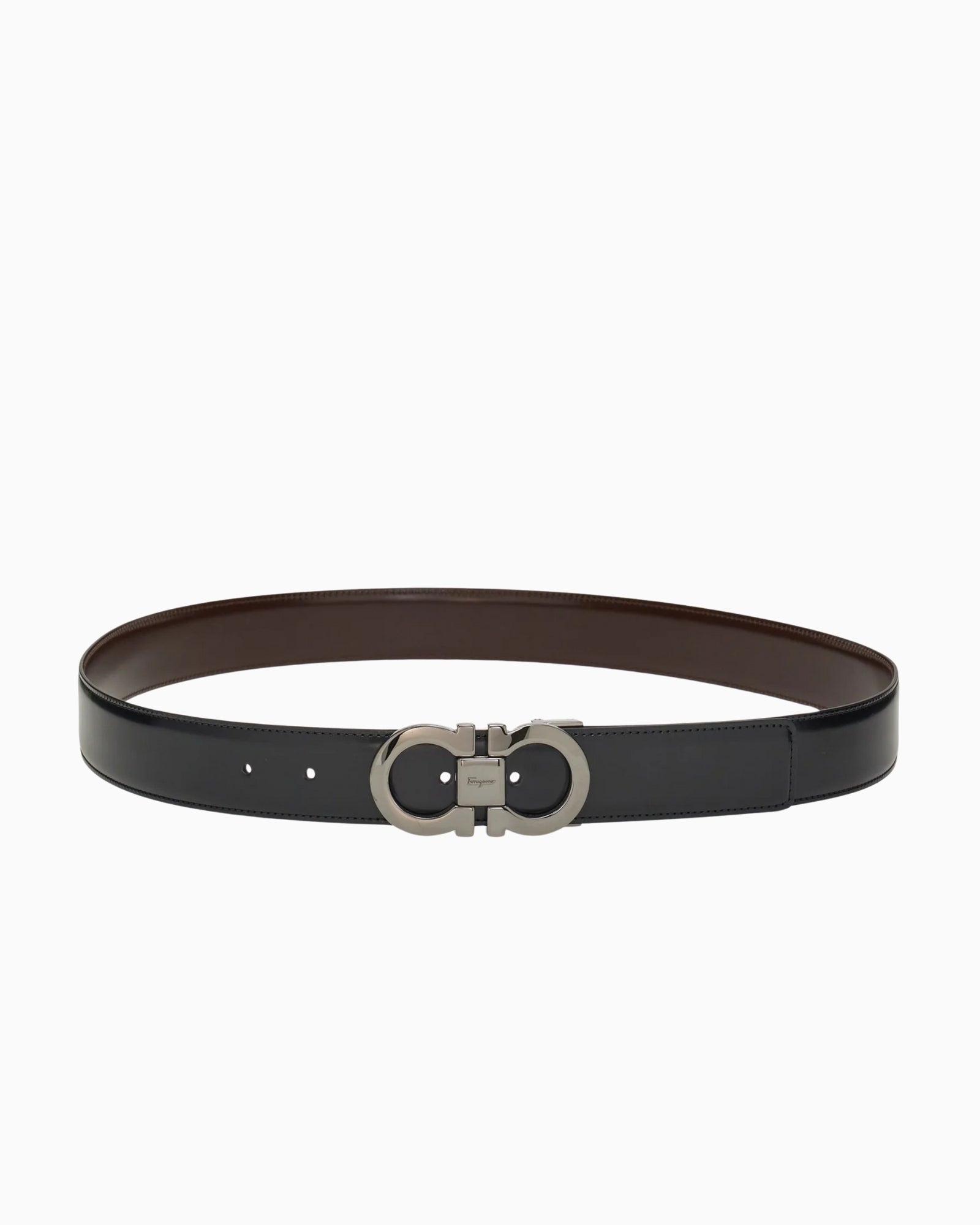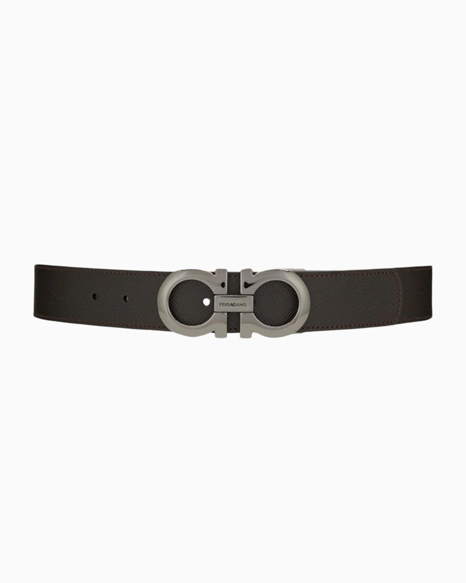 Presenta una fibbia Gancini in metallo con finitura rutenio e placca squadrata nel centro.