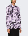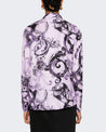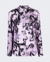 Lilla, fantasia astratta, stampa con logo all-over, maniche lunghe, orlo curvo, colletto classico e chiusura frontale nascosta.