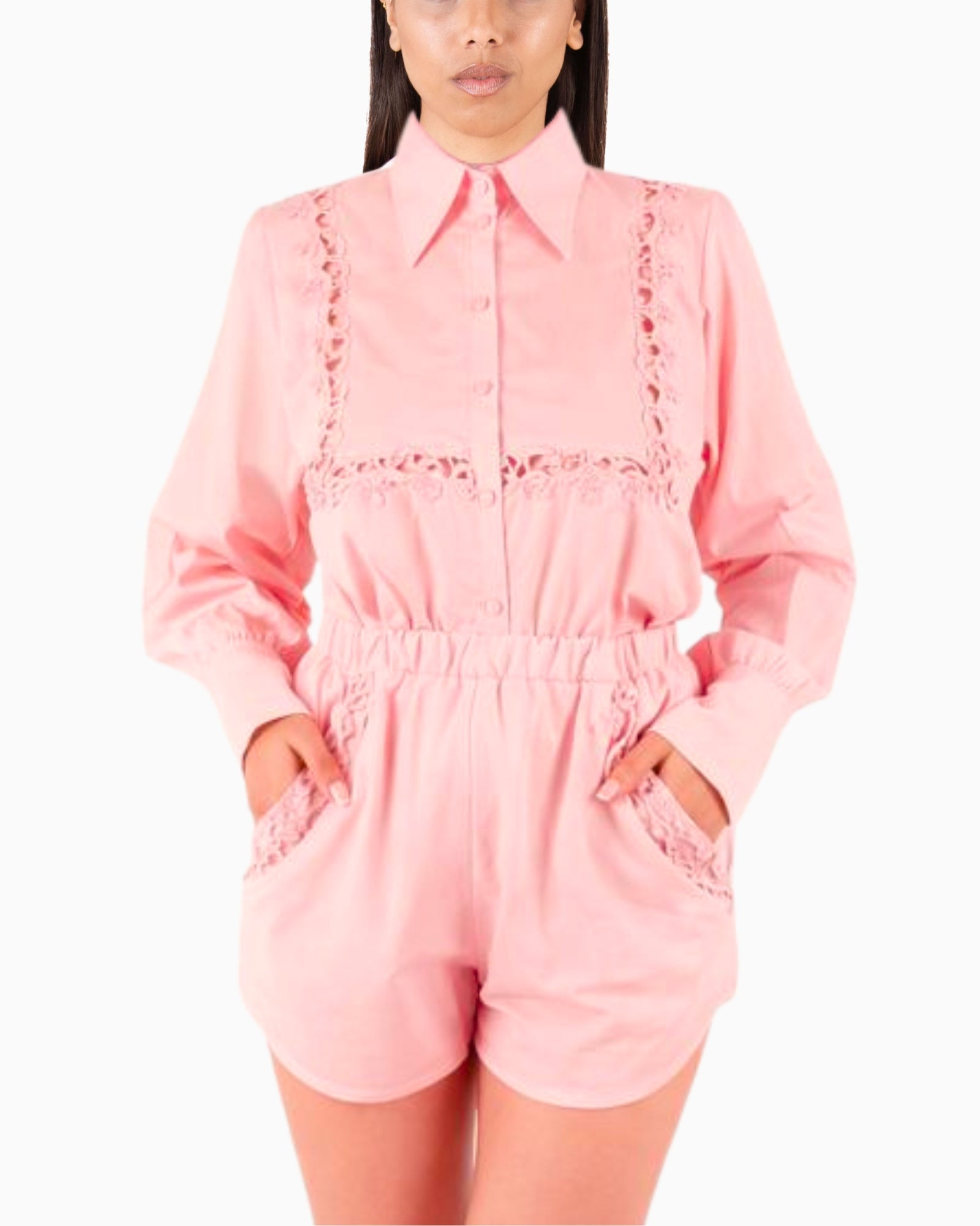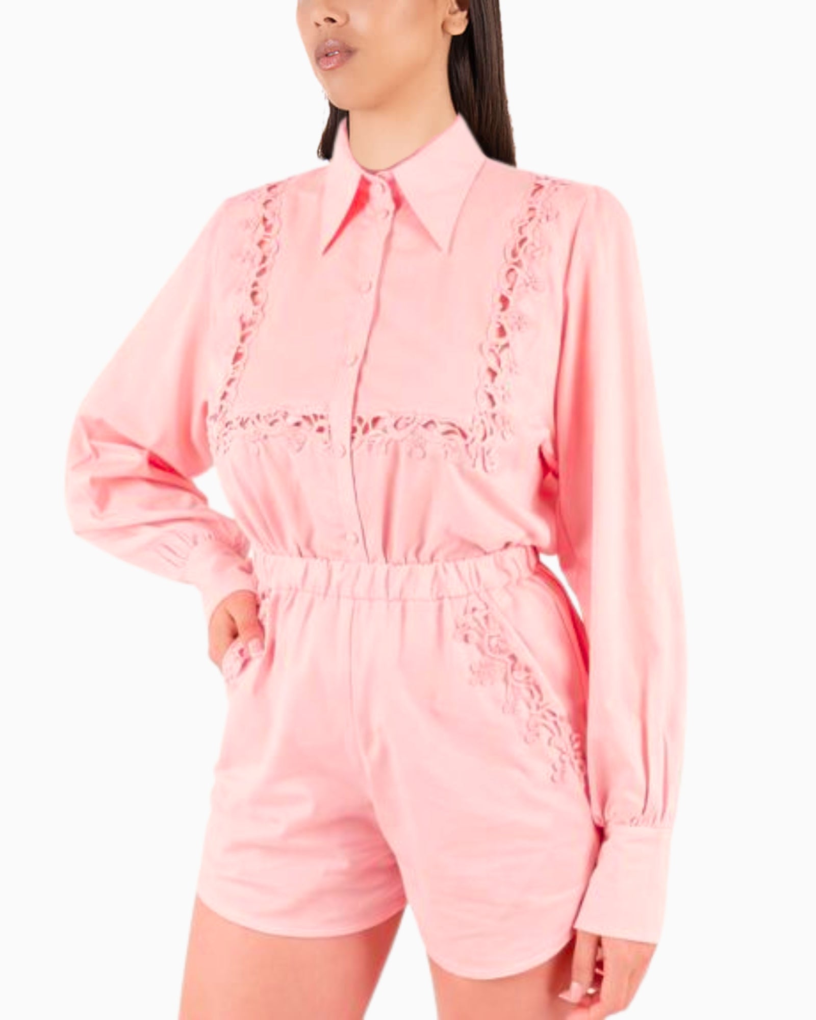 La camicia presenta una linea morbida e femminile, con chiusura frontale e dettagli decorativi in passamaneria che valorizzano il design,