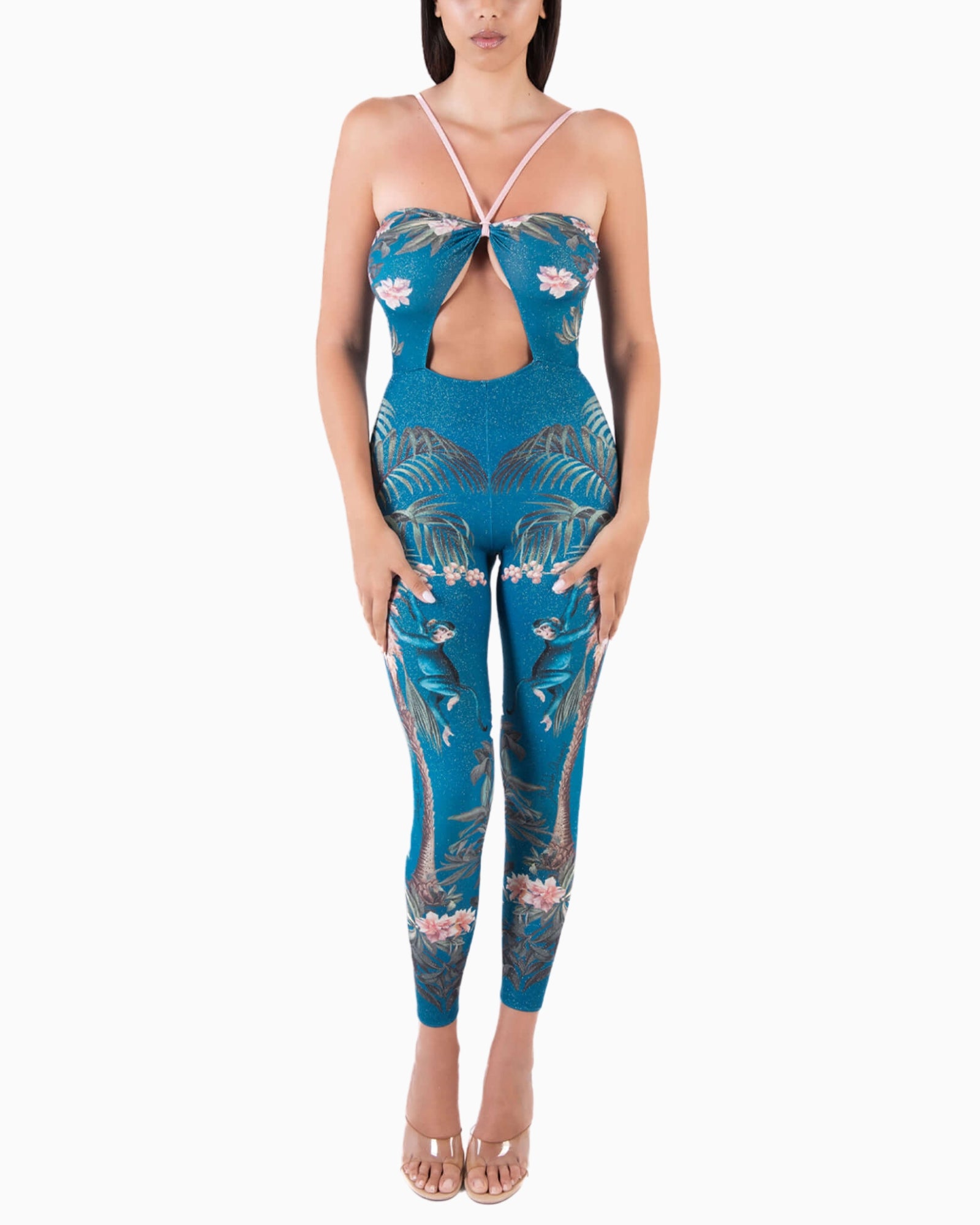 La stampa tropicale con foliage, fiori e scimmiette richiama l’estetica distintiva della collezione,