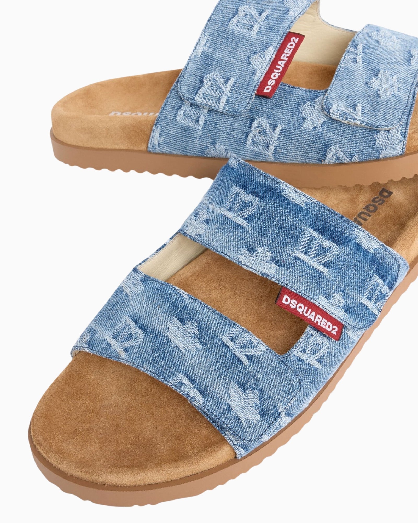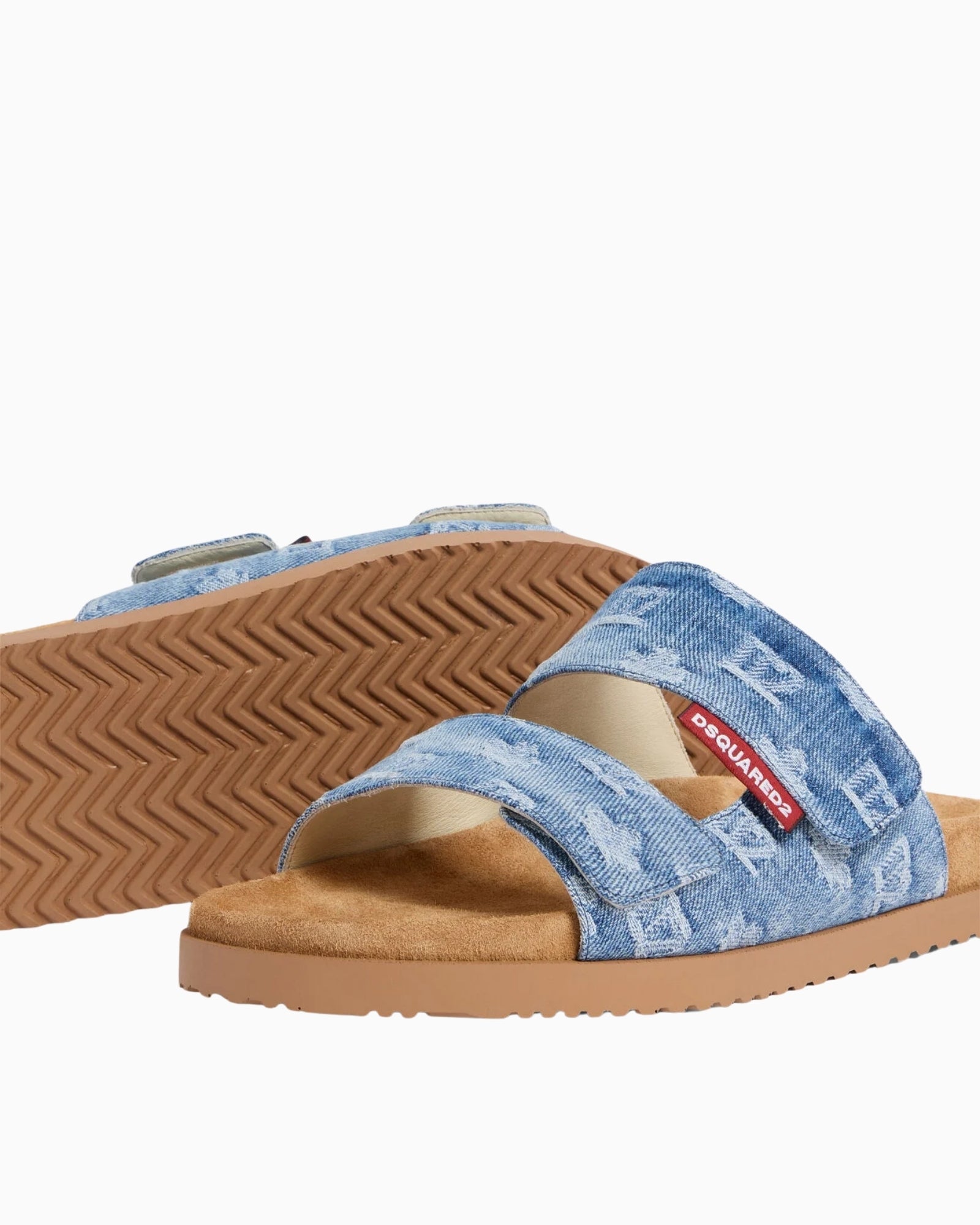 Realizzato in denim chiaro con il logo D2 all over, il modello è rifinito con i cinturini a strappo e la suola sagomata che offre massimo comfort.