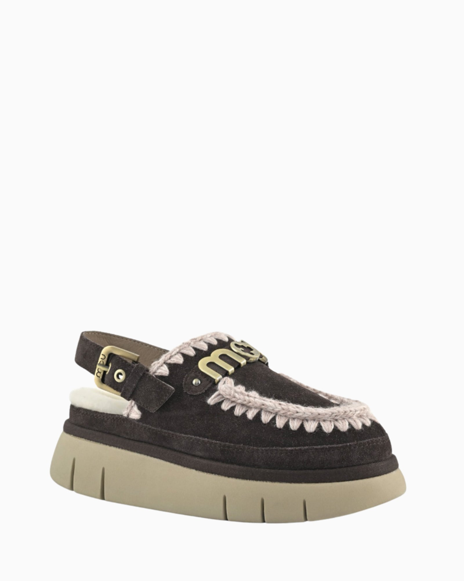 il bounce clog backstrap di mou è sapientemente realizzato a mano in vera pelle di camoscio con gli inconfondibili dettagli in lana all'uncinetto firmati mou, plantare in morbido montone, logo in metallo e suola in EVA flessibile e leggerissima.